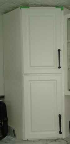 On our home renovations, I FINALLY figured out what was wrong with the doors on the corner cabinet (the one that sits on the counter and rises to the ceiling). The edges of the front faced the wrong way for the cabinet doors, and I had to add a triangle strip to the face, to turn the edges around the corner, so the hinges faced the right way. Kind of hard to describe, LOL, but here's how they came out - I even did the door handles (ignore the green paint tape, LOL)!
